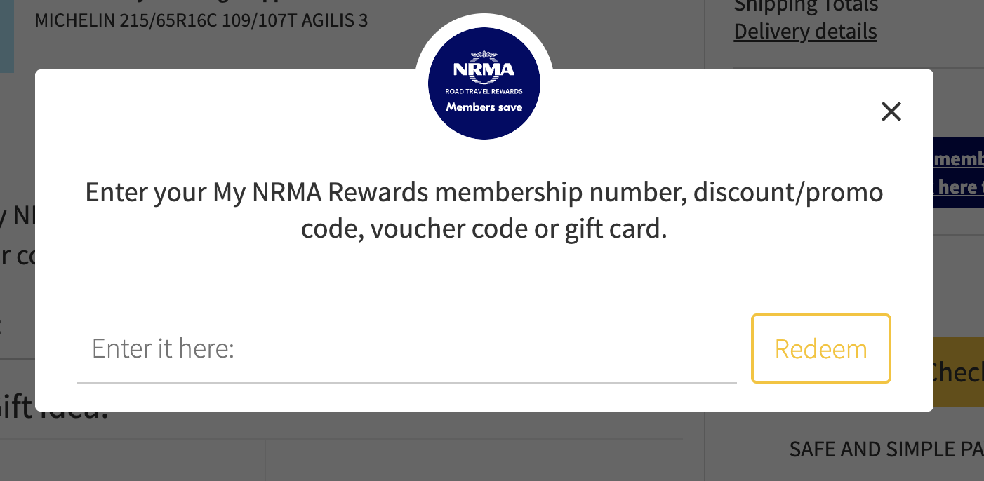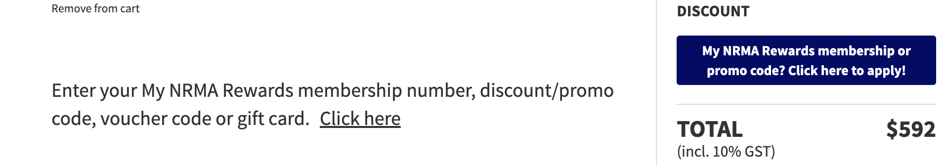 Alternatively, if you click on the blue box in the Discount section the following popup will appear prompting you to enter your NRMA Membership number, discount or promotion code, voucher code or even a gift card number!